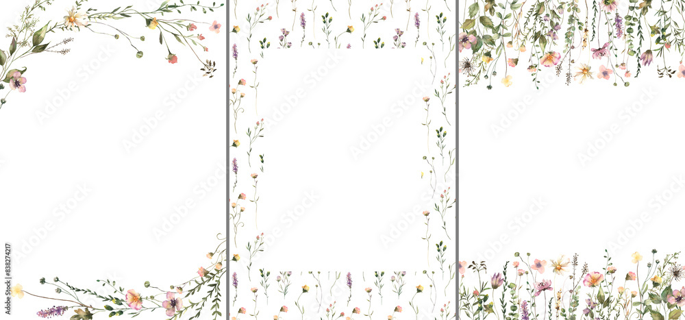 Watercolor Midsummer floral Frames collection with hand painted delicate leaves, flowers. Romantic floral arrangements perfect for wedding greeting cards, invitation. High quality illustration. #838274217