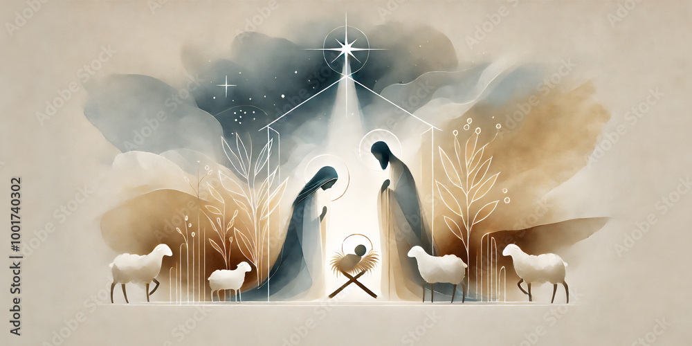 Watercolor painting representing Nativity scene in Bethlehem. Christmas scene illustration showing holy family baby Jesus in the manger Joseph and Mary. Banner. Copy space #1001740302