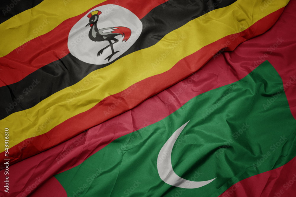 waving colorful flag of maldives and national flag of uganda. #343916310