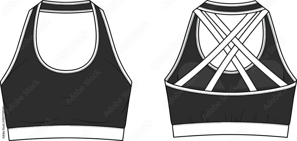 Web"Technical flat illustration of modern sports bra front and back view with crisscross strap racerback design, activewear garment emphasizing support, comfort, and style" #1957708546