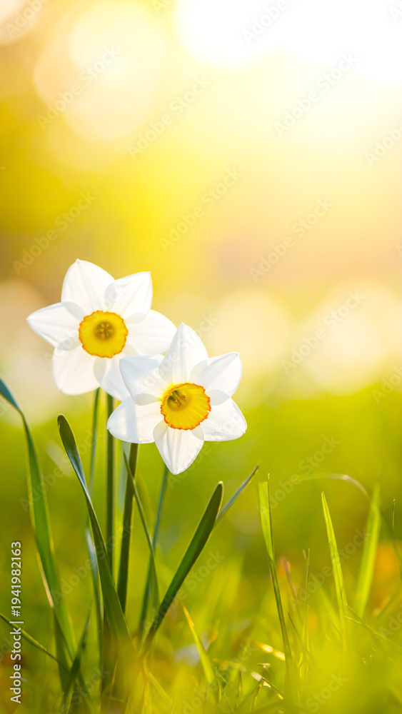 Weiße Narzisse mit gelber Mitte im warmen Frühlingslicht auf einer Wiese #1941982163