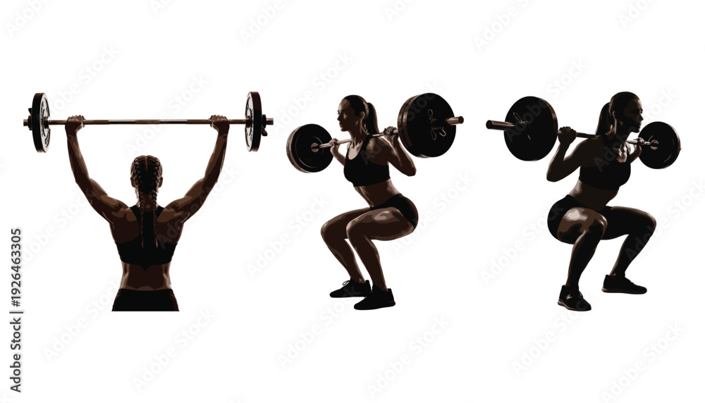 Weightlifting progression three stages of a barbell squat shown in silhouette #1926463305