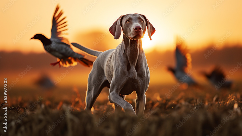 Weimaranian hunting dog in field with pheasants. Nice lighting, dog photography,hunting, hunting breeds, working dog. Weimaraner. Generative Content. #639977308
