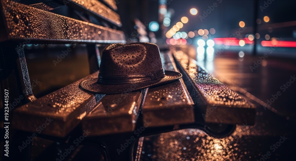 Wet Night Street Scene with Single Hat on Wooden Bench #1923441507