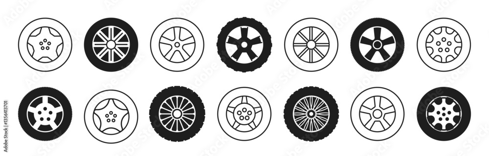 Wheel auto vector icon. Set of vehicle disk tire. Car rubber wheels silhouette. Service signs isolated on white background. #1356413701