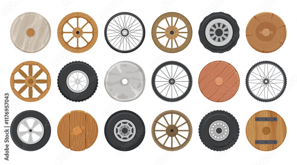 Wheels. Round forms for vehicles recent vector collection of cartoon wheels for transport #1176957043