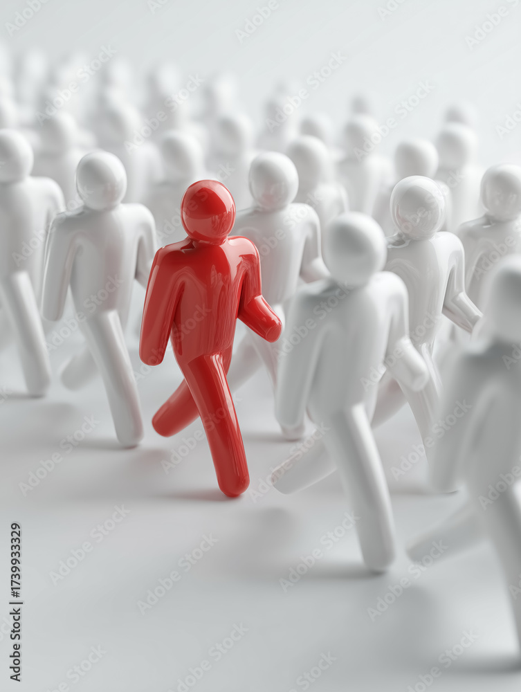 White corporate figures moving ahead energetically, one glossy red leader figure among the crowd. #1739933329