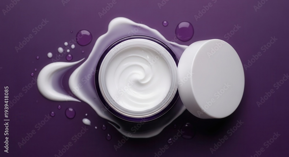 White cream in a glass jar with a white lid placed on a purple background, surrounded by drops of cream and liquid, showcasing a smooth texture and glossy finish #1939418085