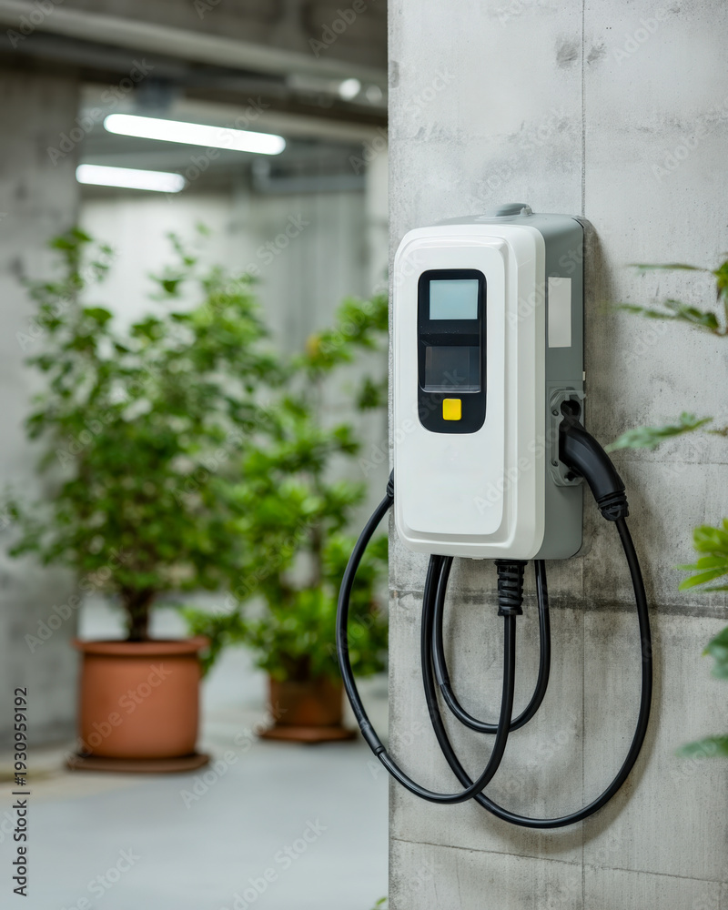 White electric car wallbox charging unit with unplugged cord in home garage #1930959192