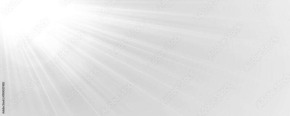 White glowing starburst shines with sparkling rays and soft lens flare effect. Sunlight reflections enhance the bright atmosphere. Ideal PNG for light overlays and postcards. #1904507485