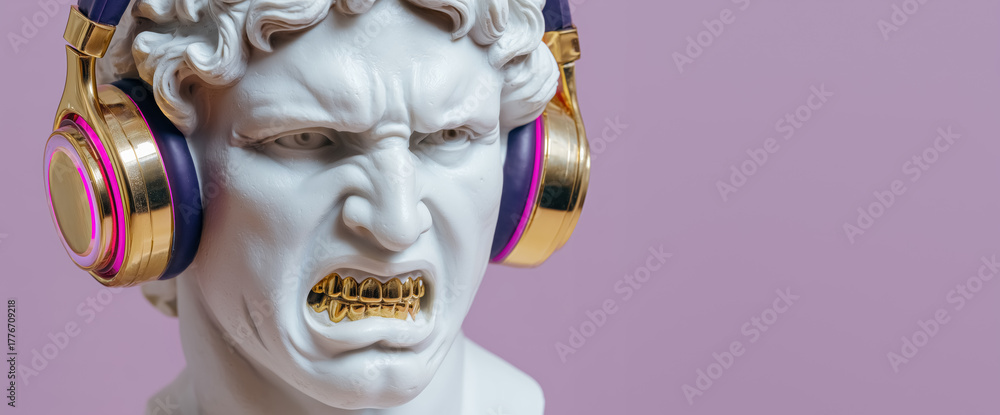 White plaster male head sculpture showing gold plated grillz teeth with large headphones on a purple background with copy space. #1776709218