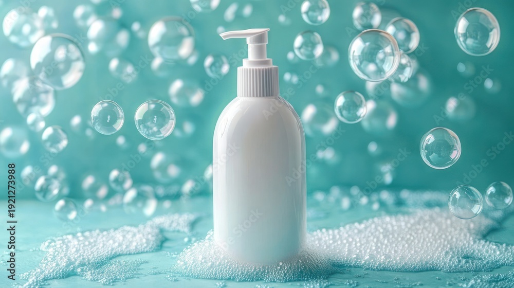 white pump soap bottle surrounded by foam and floating bubbles on a teal surface, fresh clean and playful mood #1921273988