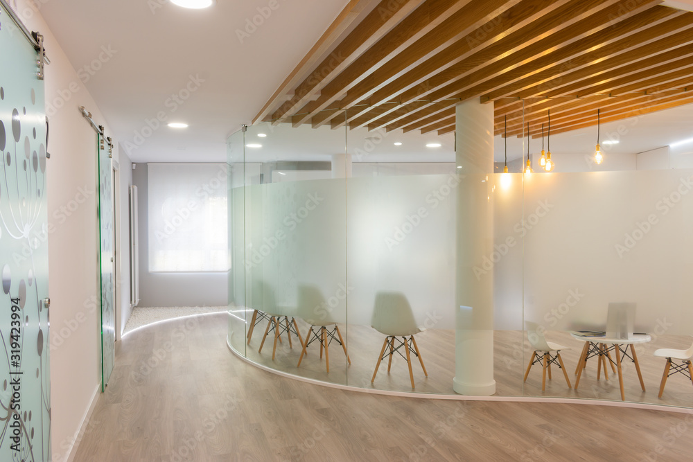 white waiting room lit with empty chairs #319423994