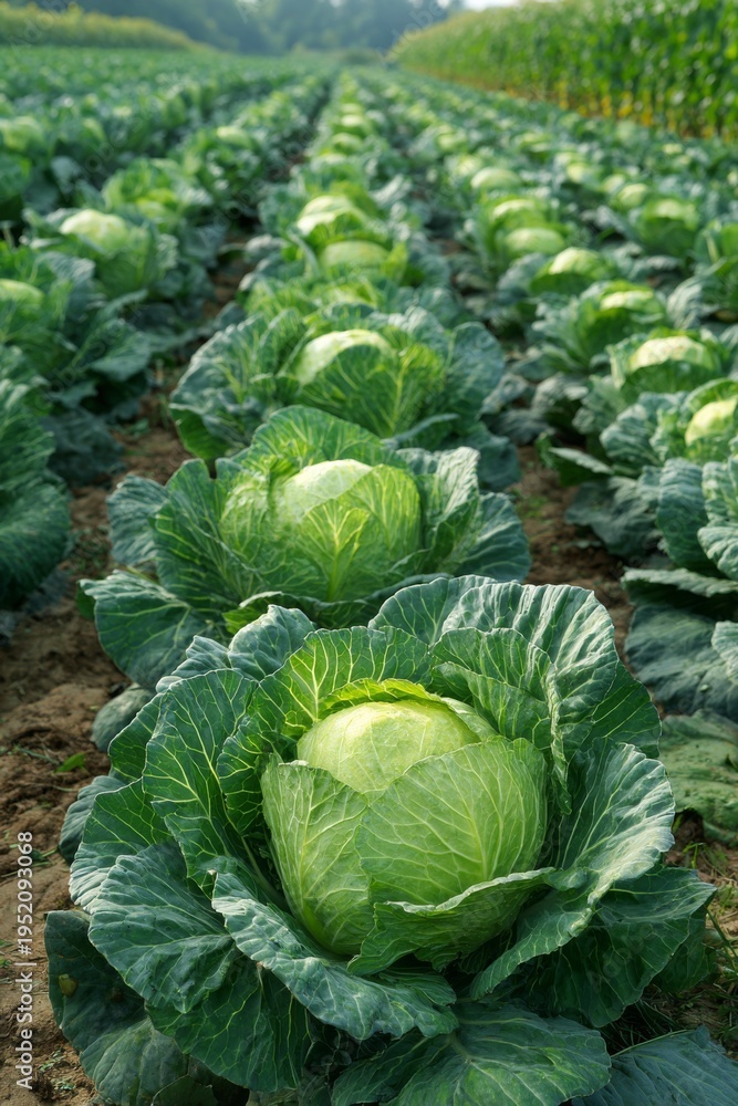 Wide agricultural field with rows of green cabbage crops stretching toward the horizon in bright daylight under clear sky #1952093068