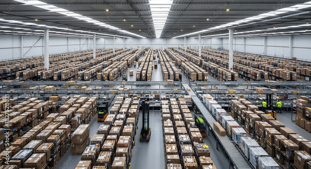 Wide-angle view of a large, busy distribution warehouse filled with countless stacked cardboard boxes and working forklifts, representing efficient logistics and supply chain operations. #1827528031