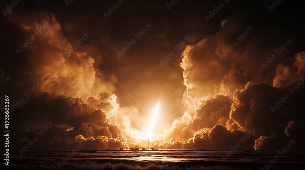 Wide cinematic shot of a missile launching from a ground base at night, massive fire and smoke plume, bright ignition flame lighting the sky, dramatic clouds #1935665267