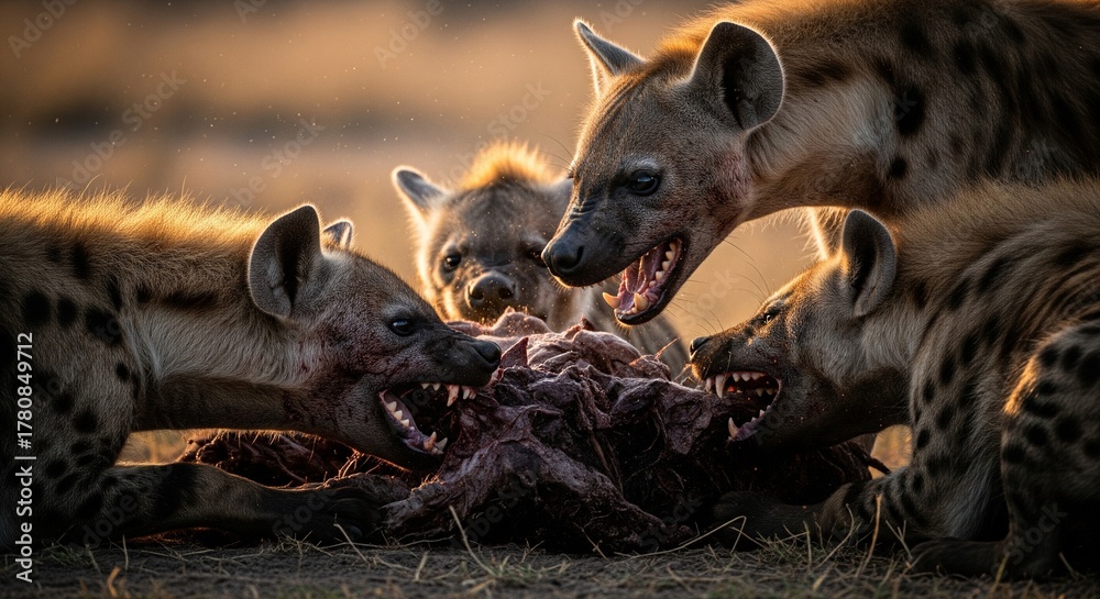 Wild Hyenas Feeding on Prey at Sunset in African Savannah – Wildlife Predator Scene #1780849712