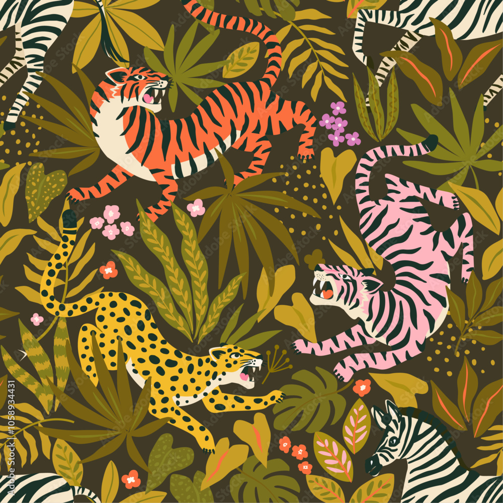 Wild tigers, leopards and zebra on tropical plants flower background. Safari animal print. Fashionable fabric design.Vector seamless pattern. #1058934431