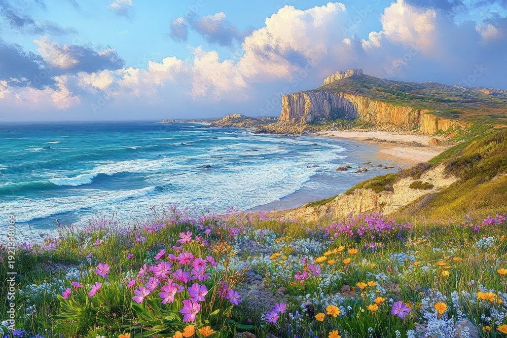 wildflower meadow overlooking sunlit coastal cliffs, turquoise waves and soft clouded sky, a peaceful uplifting seaside scene #1921338069
