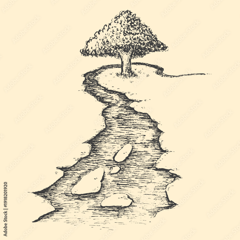 Winding river road leading to single alone tree, hand drawn vintage sketch style vector illustration. Minimalist monochrome nature art composition for print. #1918201920