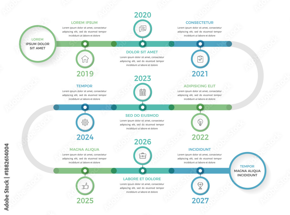 Winding timeline infographic template with 9 milestones showing progression through multiple years with icons and text sections #1882614004