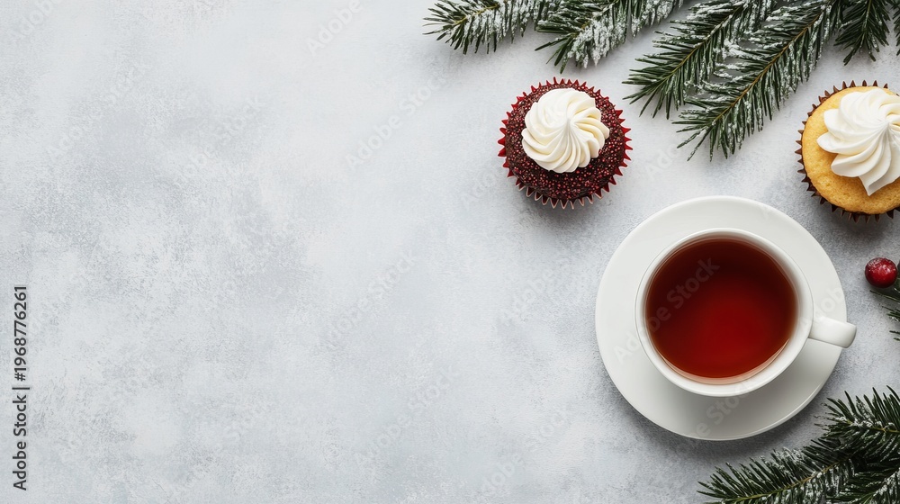 • #1968776261 Winter flat lay Cozy tea, frosted cupcakes and snowy pine branches on a gray backdrop with copy space. Ideal for holiday greetings and festive invitations. ,Holiday,Cozy