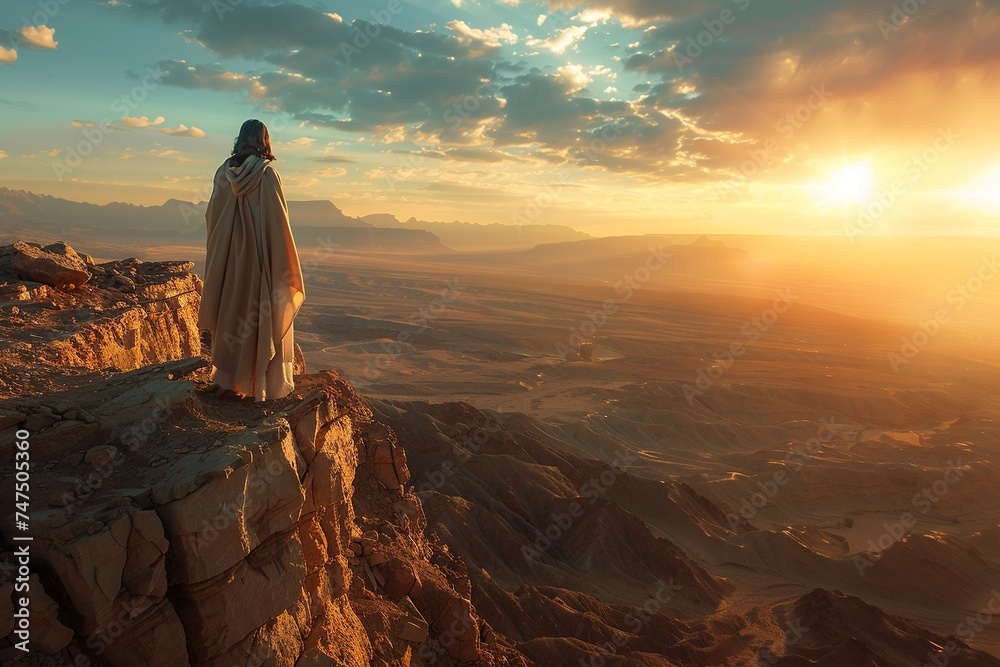 Witness Jesus standing on a high cliff, torn between earthly desires and heavenly mission, grappling with the allure of miracles, fame, and adulation #747505360