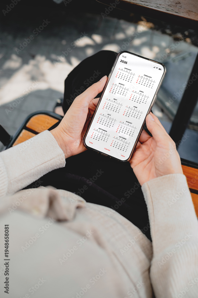 Woman checking calendar on smartphone outdoors. Digital planning, schedule management, time organization and productivity lifestyle concept #1948658081