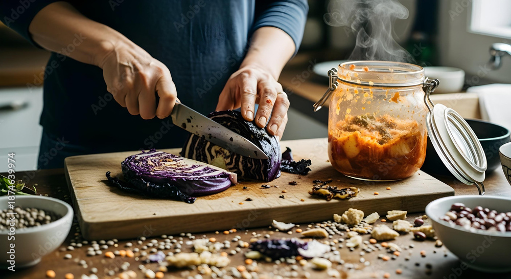 Woman chopping vegetables in kitchen soft close up view #1874639974