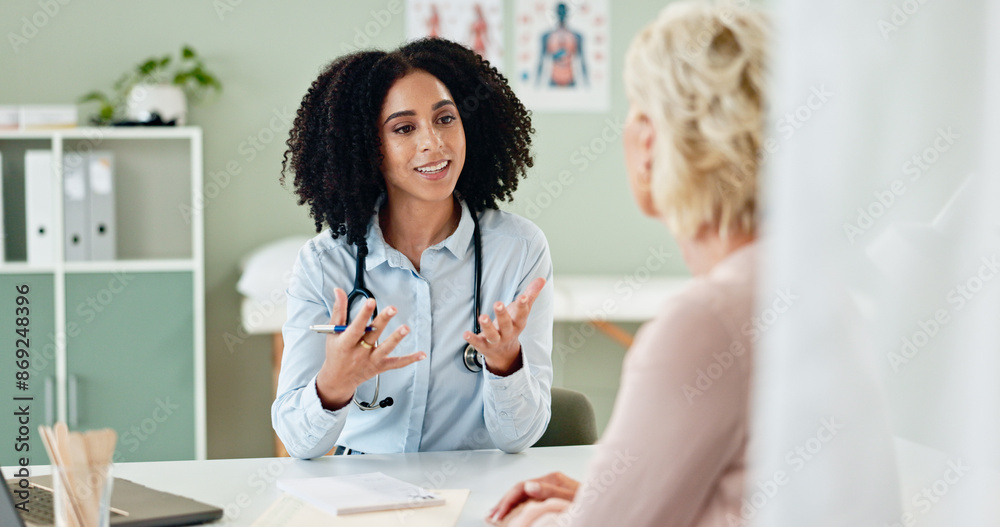 Woman, doctor and consultation with patient for medication, prescription or diagnosis at hospital. Female person talking or consulting to client for dosage, procedure or results at office or clinic #869248396