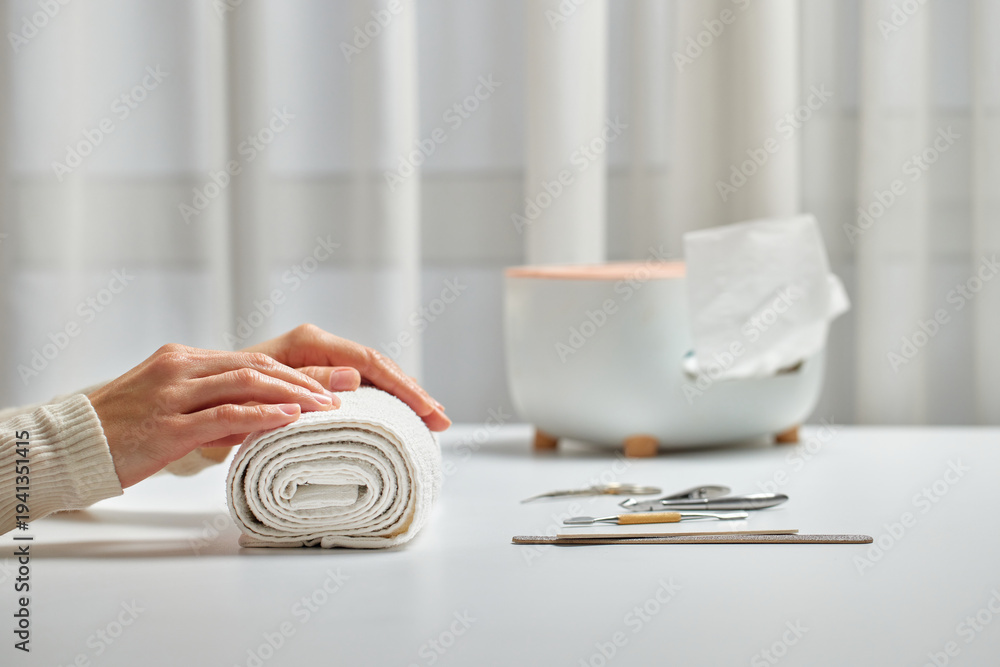 Woman enjoying a self-care beauty routine with a hand on a rolled white towel #1941351415