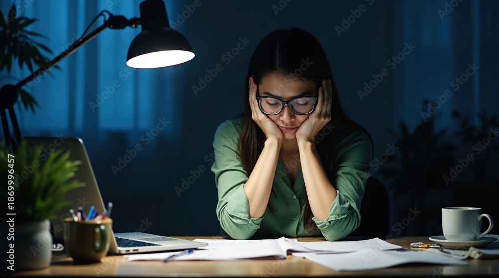 Woman feeling exhausted and overwhelmed while working late at her desk at night #1869996457
