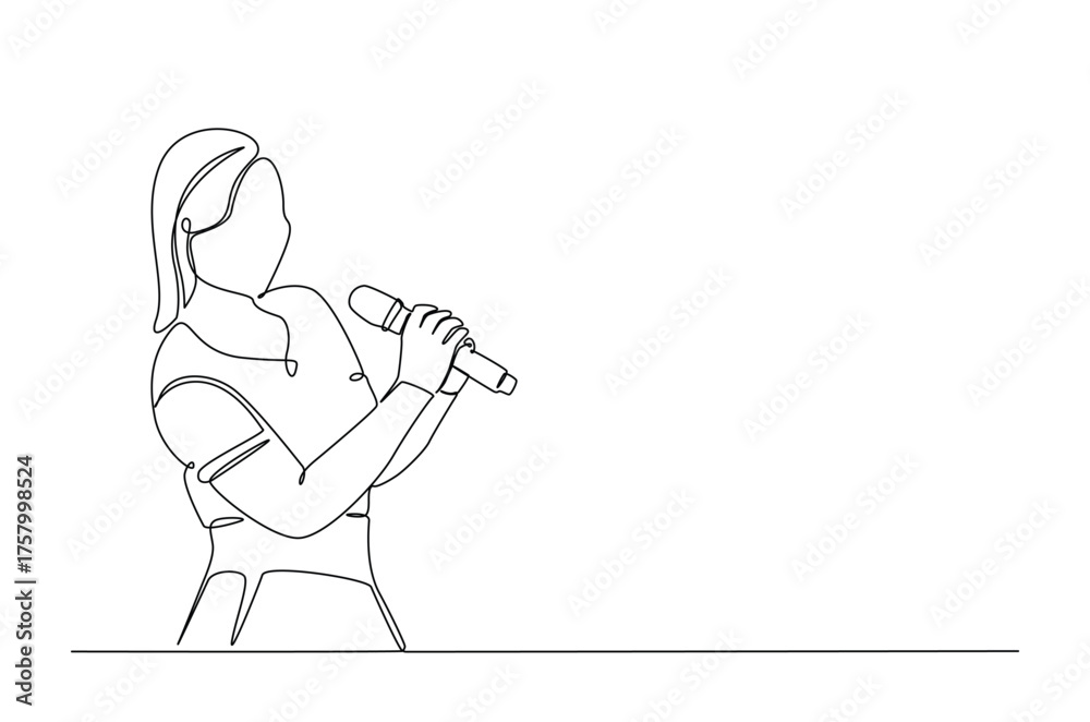 Woman holding microphone singing favorite song in continuous one line drawing. Single line art illustration of vocalist performing in festival. #1757998524