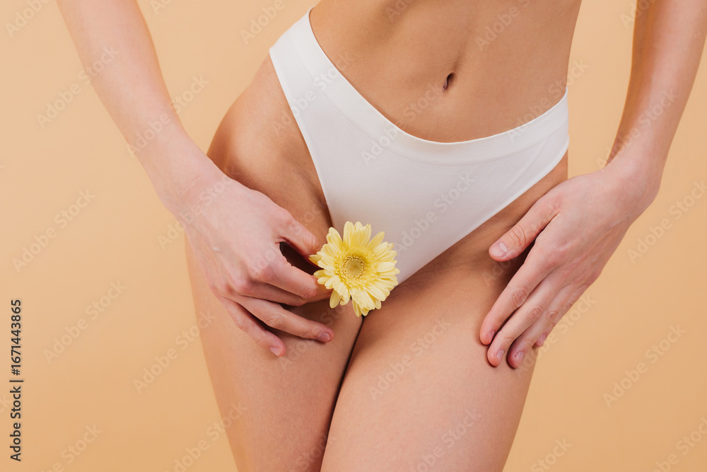 Woman holding yellow gerbera flower near her groin, intimate hygiene concept on beige #1671443865