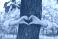 Woman hugging tree trunk and forming heart with hands in forest #441955353