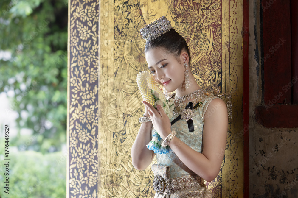 Woman in traditional Thai attire holds floral garland, standing by ornate golden door, exuding grace and cultural elegance #1776449329