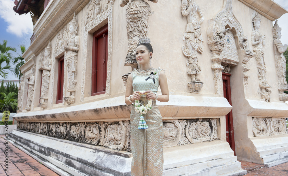 Woman in traditional Thai attire stands gracefully in front of intricately carved temple, holding floral garland. scene exudes cultural elegance #1776449360