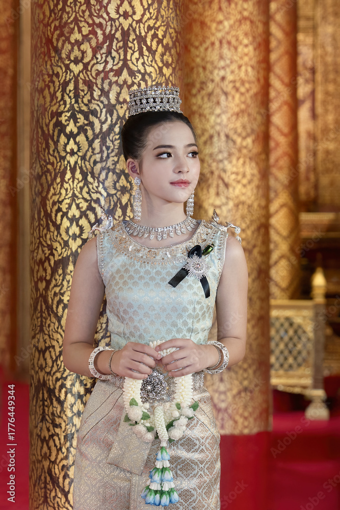 Woman in traditional Thai attire stands gracefully in ornate setting, wearing crown and holding floral garland #1776449344