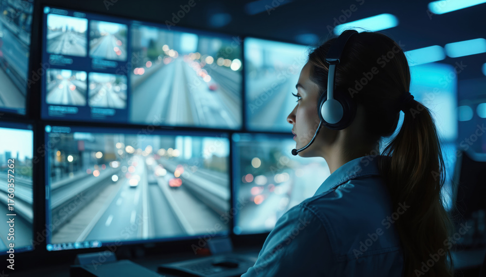Woman monitors surveillance system in control room. She wears headset watching traffic on multiple computer screens. Security officer observes real time urban city data. #1760357262