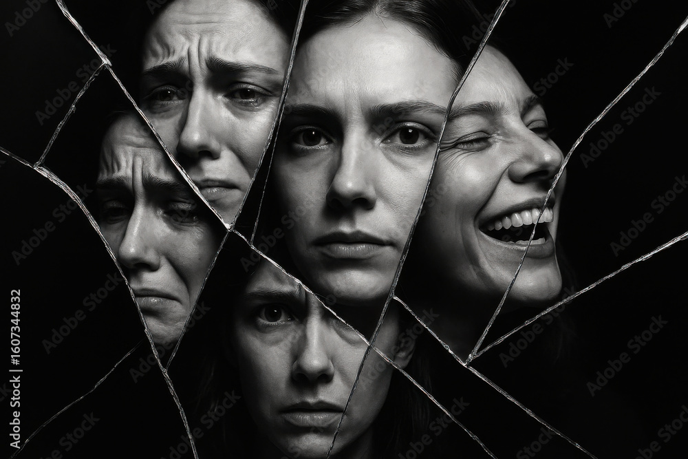 Woman reflecting multiple emotions and personalities in broken mirror #1607344832