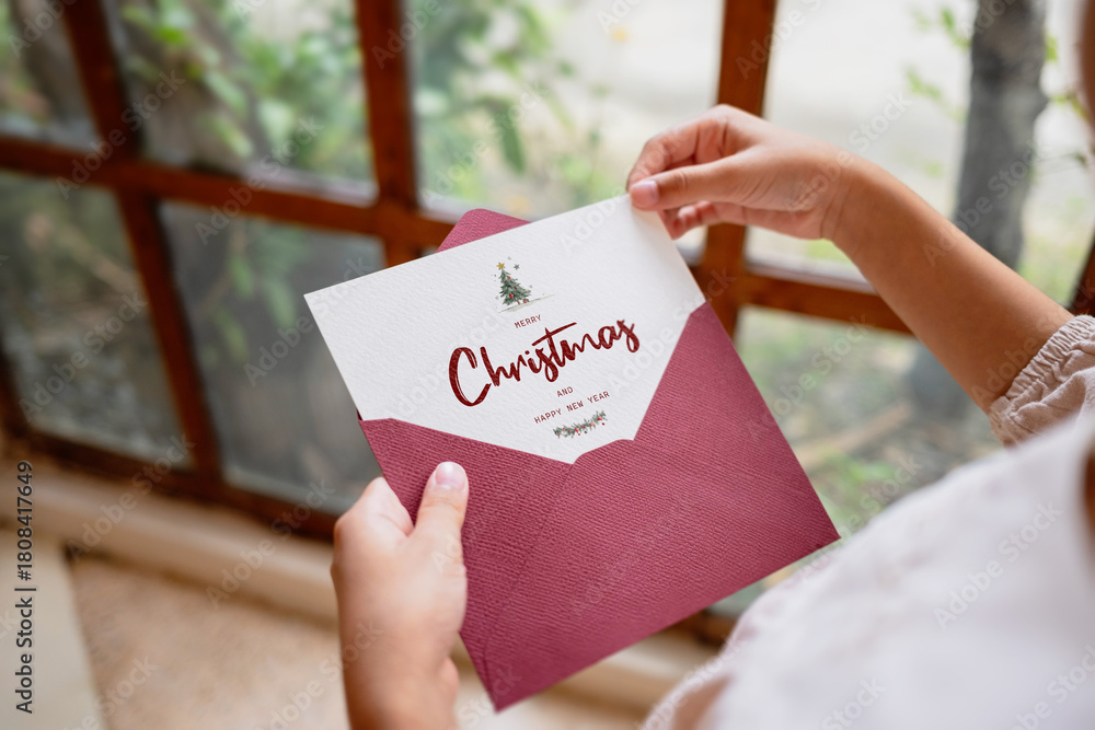 Woman's hand holding merry christmas greeting card on background and ornaments. Merry christmas and happy new year concept #1808417649
