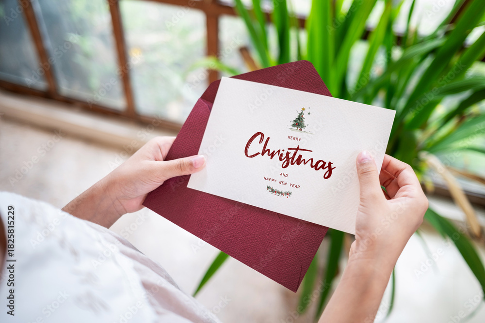 Woman's hand holding merry christmas greeting card on background and ornaments. Merry christmas and happy new year concept #1825815229