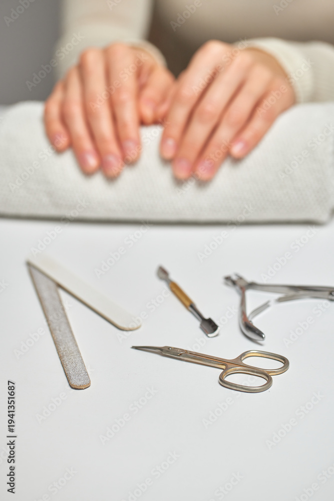 Woman's hands resting on a towel with various manicure tools on a white surface #1941351687