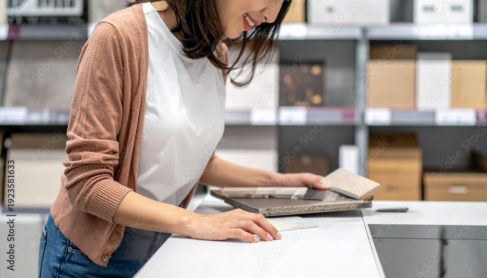 Woman Selecting Tiles at Home Improvement Store Interior Design Choices Project Inspiration Renovation and Remodeling Options. #1923581633