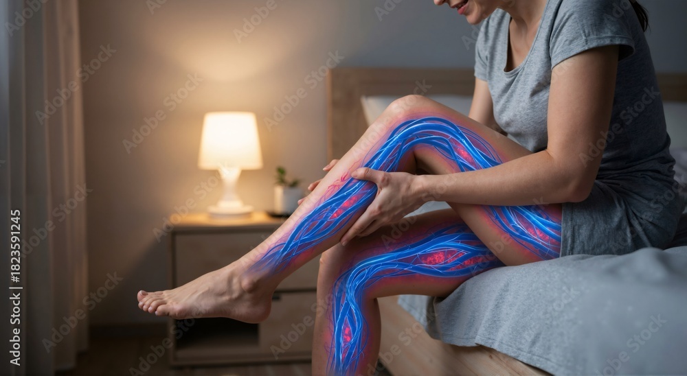 Woman suffering from leg pain, with visible digital arteries and veins overlay. Varicose veins and circulatory system issue concept. #1823591245