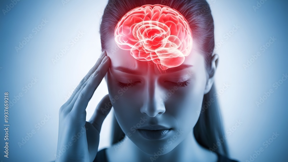 Woman suffering from severe headache and migraine. Mental health and neurology. Female person touching temples with glowing red brain showing stress and pain #1937659218
