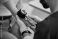 Woman undergoing skin examination by male dermatologist using dermatoscope on forearm, medical professional wearing gloves performing diagnostic procedure #1827446162