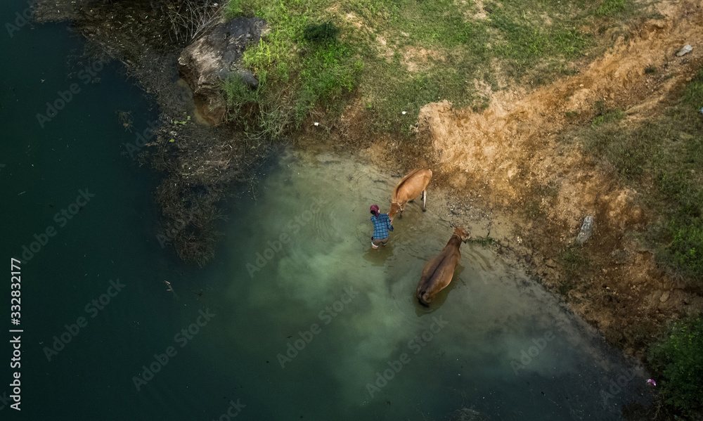 Woman washes cows in the river #332832177