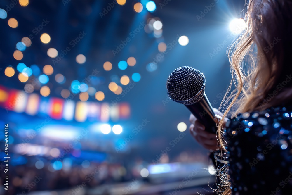 Woman with a microphone on a stage with flags from different countries, music live show event, international song contest #1945689114