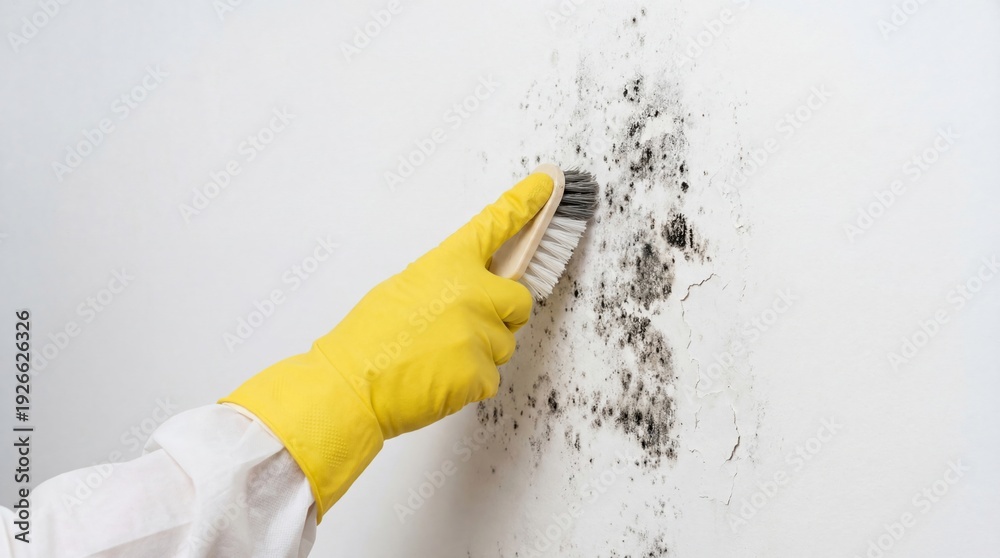 Woman with yellow glove brushing black mold from a white wall. Environmental cleanup concept for home hygiene and health problem prevention. #1926626326